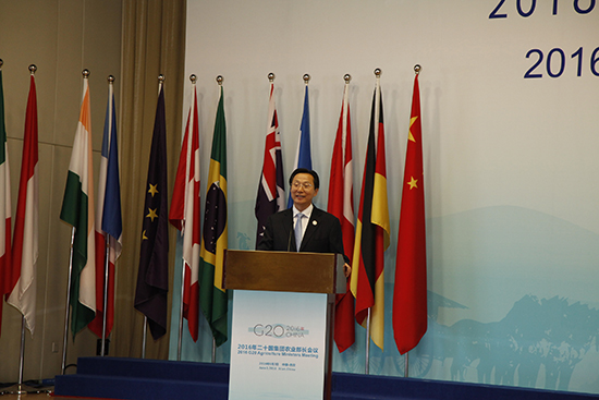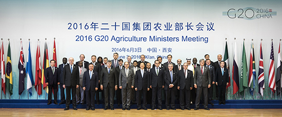 2016年6月3日,二十国集团(G20)农业部长会议在陕西西安成功召开。农业部部长韩长赋转达了习近平主席对会议召开的祝贺,习近平主席欢迎各位代表来到中国西安,共商全球农业发展合作大计。二十国集团成员和嘉宾国的农业部长,联合国粮农组织、世界粮食计划署、国际农发基金等国际机构主要负责人出席会议。会议通过《G20农业部长会议公报》。中国代表团团长、农业部部长韩长赋主持会议并在开幕式上致辞。