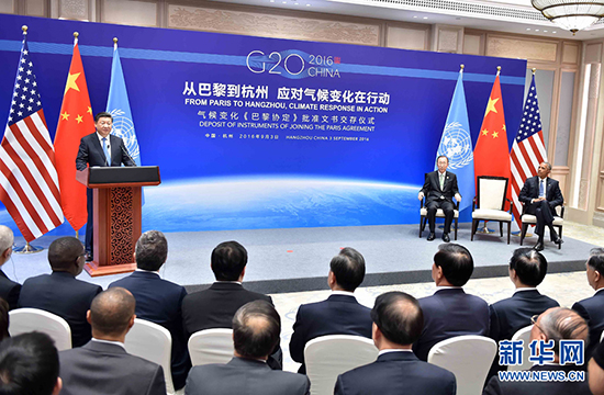 9月3日,国家主席习近平同美国总统奥巴马、联合国秘书长潘基文在杭州共同出席气候变化《巴黎协定》批准文书交存仪式。 新华社记者李涛摄