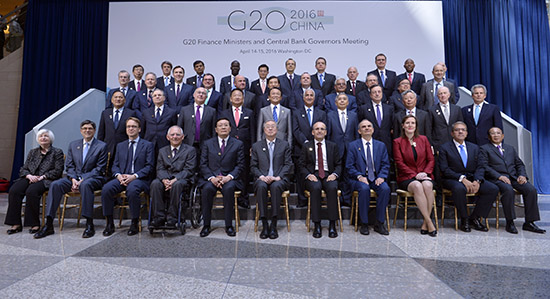 2016年4月14日至15日,二十国集团(G20)财长和央行行长会议在美国华盛顿举行。财政部部长楼继伟和中国人民银行行长周小川共同主持会议。会议主要讨论了当前全球经济形势、增长框架、国际金融架构、投资和基础设施、金融部门改革、国际税收合作、反恐融资、绿色金融及气候资金等议题,并发表了联合公报。